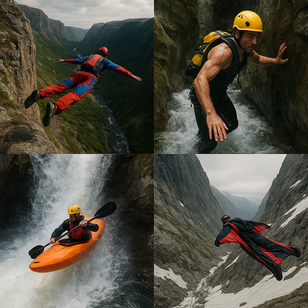 Przypominający kształt lotki kombinezon umożliwia człowiekowi ślizganie się w powietrzu z prędkościami dochodzącymi do 200 km/h. Wingsuit Flying to połączenie skoku ze spadochronu z akrobatyką powietrzną – pilot manewruje tu za pomocą niestandardowo rozłożonych skrzydełzystych odzieży, szukając idealnej trajektorii lotu. Kluczowym elementem jest precyzyjne wyczucie odległości od ścian wąwozu oraz planowanie otwarcia czaszy spadochronu.
